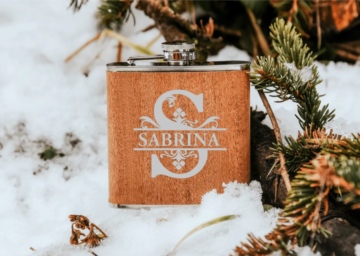 Der Flachmann ist auch in einer Holzvariante erhältlich. Der hölzerne Flachmann wird durchdringend graviert, wodurch das darunterliegende Metall sichtbar wird und ihm eine elegante Note verleiht. Er misst 110x90x21 mm und hat eine Kapazität von 170 ml.